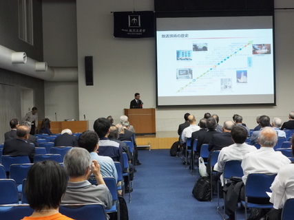 放送技術について、その歴史を辿り、今後の進展、将来像などを講演されました。360°映像、立体映像、特別なメガネを必要としない3次元TVなどの映像表現の高度化、スマフォを起点とたTVアクセスやネットサービス連携を強化し生活の中に放送コンテンツを一層取り入れる、さらにIoTと連携したメディア技術開発を進めていくなど将来像を、映像をまじえ具体的に講演されました。