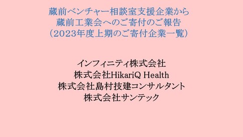 - ご寄付をいただきました各社のご厚志に感謝し、蔵前ベンチャー相談室の支援活動に使わせていただきます。