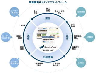 当社は、飲食店出店者・開業者及び飲食店運営者と、飲食店に関わる各事業者(不動産事業者、食材仕入事業者等)とを繋ぐ「飲食店.COM」をはじめとした、飲食業向けメディアプラットフォームを運営しています。 インターネット、テクノロジーの力を最大限に活用し、飲食店の出店開業・運営に必要な「ヒト・モノ・サービス」をタイムリーに結びつけ、飲食業界全体のさらなる発展、成長に貢献したいと考えています。
