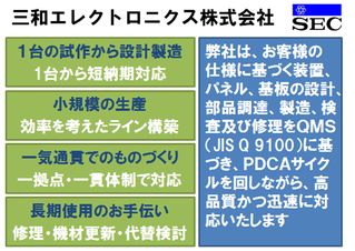・創業から40年以上のエンジニアリング・サービスからソリューション事業(電気・電子系の開発・設計から部品調達・製造まで一貫対応)をベースとし、その経験からオリジナル(安全・エコ製品、レトルト・健康食品)も展開。