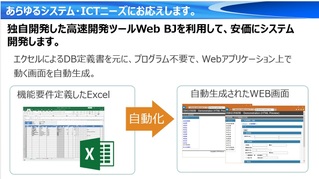 ICT企業として、保険、商社、医療、通信分野を中心に20年以上のシステム開発と通信ビジネスを展開しております。コンサルタントによる要件定義~プロジェクト管理~プログラム開発~運用保守まで一気通貫でサポートします。1. 自社開発の高速開発ツールによる工数削減、2. ベトナムオフショア開発によるコスト削減、3. RPAツールによる業務削減、4. 働き方改革ソリューションをお客様に提案しております。ホームページをご覧ください。